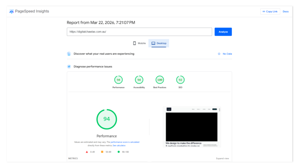 A perfect 100 on Best Practices. Performance and Accessibility both at 94 — comfortably in the green range. SEO at 92, giving the site a solid base to build organic visibility from. For an agency that sells web design and performance, having these numbers on our own site matters — it would be hard to justify anything less.